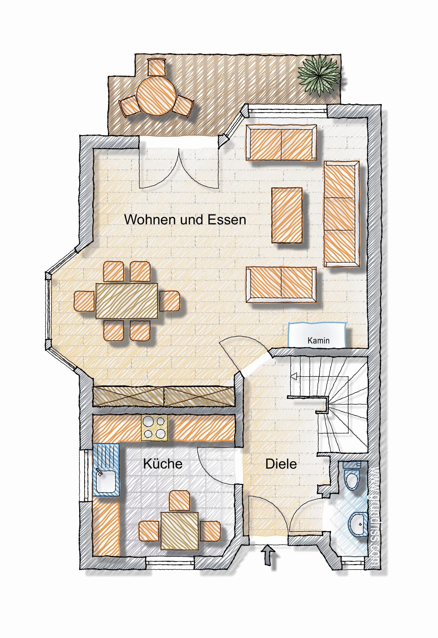 Ein Gäste-WC im großzügigen Eingangsbereich des Hauses, rundet diese Etage ab.