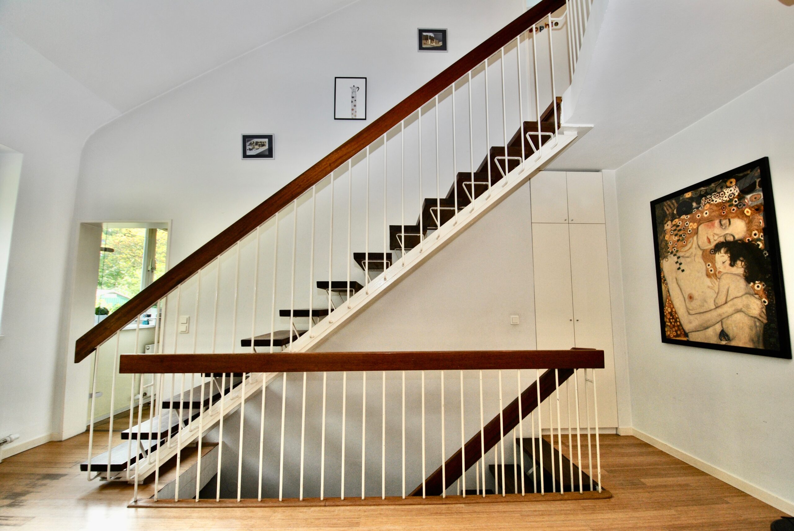 Schon die Diele des Eingangsbereiches wirkt in seiner Gestaltung offen und großzügig. Im Mittelpunkt steht hier die geschmackvolle und offene Treppe, die